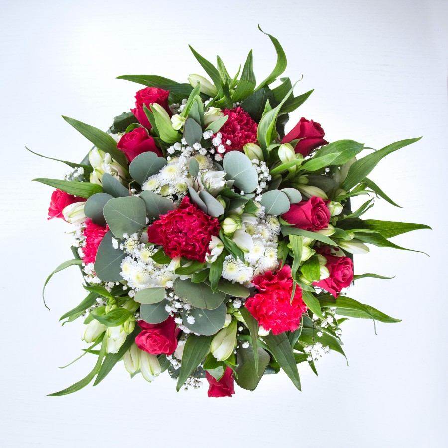 Delight in the charm of our Red Roses & White Chrysanthemums Arrangement. This beautiful bouquet features luxurious red roses intertwined with mini white chrysanthemums and gypsophila. Accentuated by carnations, white alstroemeria, and elegant aspidistra leaves, the design exudes sophistication and grace.
