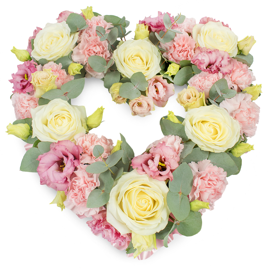 Express your deepest sympathy with our Elegant Open Heart Tribute. This stunning arrangement showcases a harmonious blend of white roses, pink carnations, pink lisianthus, and eucalyptus leaves, artfully designed to honor and remember your loved one.